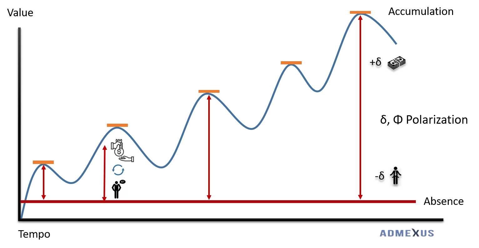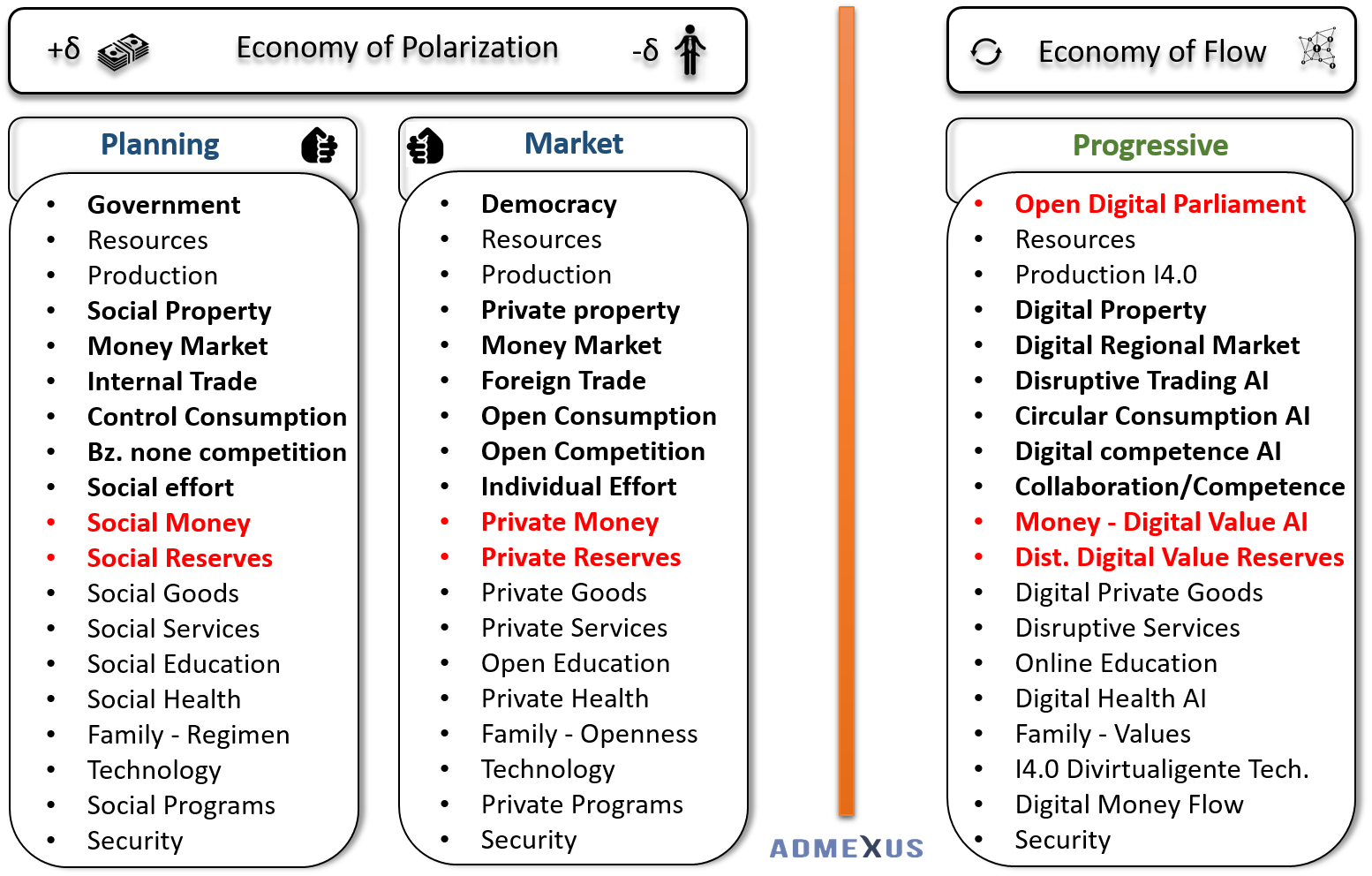 The Admexus research demonstrates an analogous behavior between the Planning and Market economy through a common denominator, which is identified by the management, distribution, control and accumulation of money, resources, goods, reserves and value added. An example of this common denominator is "private money" and "social money" displayed in red color on the table. Both seem to be antagonistic, but in realism, they have the same merits. This affirmation is demonstrated by the behaviors of a person, people or organisms that subjugate the management of money, resources, reserves and the collection of creation of value added by the productive processes and / or individual work efforts. This procedure has identified as "Polarization Economy"; when one pole represents the monopolization of richness, while the opposite pole represents the insufficiency money and poverty. This polarization model is support by concurrent and divergent nodes, functions and forces.
