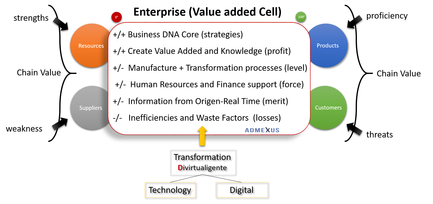 The company is the main live cell of value added at productive, economic and social ecosystems. Therefore, the company-business cell is the key model of transformation and contribution for value added. It is made of a: central governance nucleus, productive processes, labor, resources, money flow, inputs and other subsystems interconnected and a synchronized way, that can manufacture products, goods and services of value added to the marketplace. These products, goods and services offered, is evaluated on price, quality, delivery and tangible sense by the client, which if it meets the desired profit expectation, it pays to acquire it. This is the essential cycle of value and remuneration progression. The enterprise value cell, it has a continuous change, based on internal or external factors, generated for the environment and the value chain location where it is situated. Therefore, the business value added cell is the transformation substance and spirit of productive, economic and social progress.