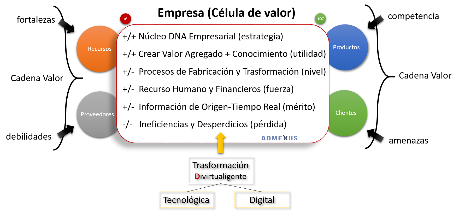 En la investigación, mapeo y el análisis realizado por Admexus durante varios años sobre el comportamiento de las células empresariales de valor agregado, se encontró que del 50% al 70% son actividades de “no valor agregado” y del 25% al 47% son actividades de “valor agregado”. La diferencia restante en porcentaje entre estos factores, corresponde a las ineficiencias y a los desperdicios.